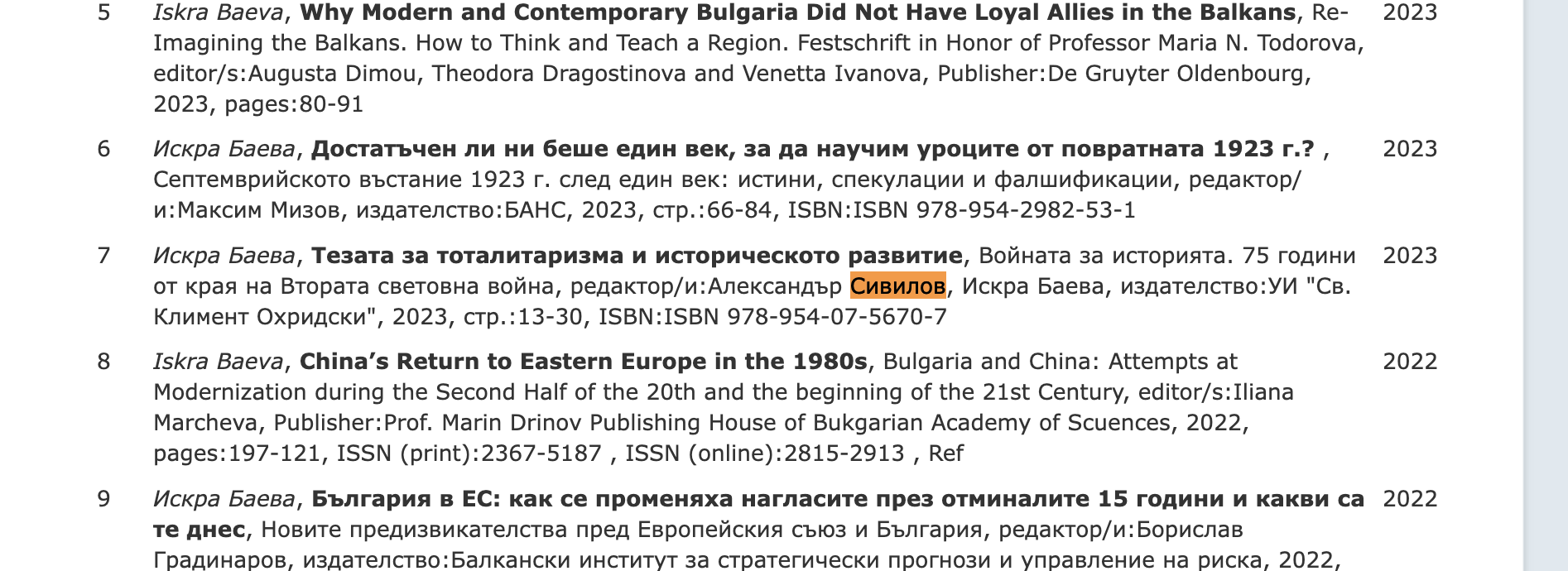 Картинка: списък с научни приноси на Баева от База данни за научната дейност на Софийски университет "Св. Климент Охридски", в който се виждат съвместните статии със Сивилов