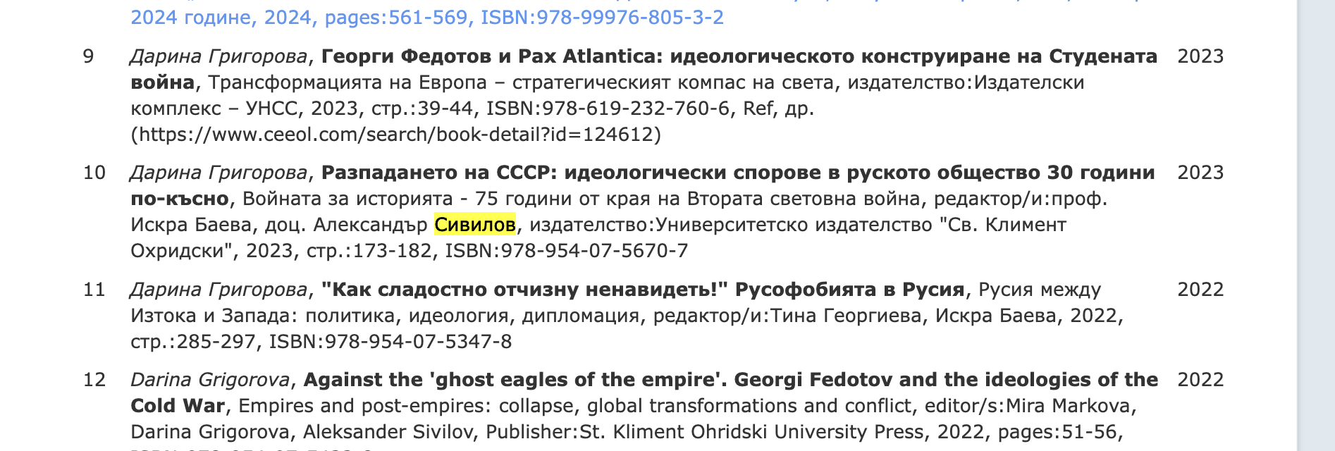 Картинка: списък с научни приноси на Григорова от База данни за научната дейност на Софийски университет "Св. Климент Охридски", в който се виждат съвместните статии със Сивилов
