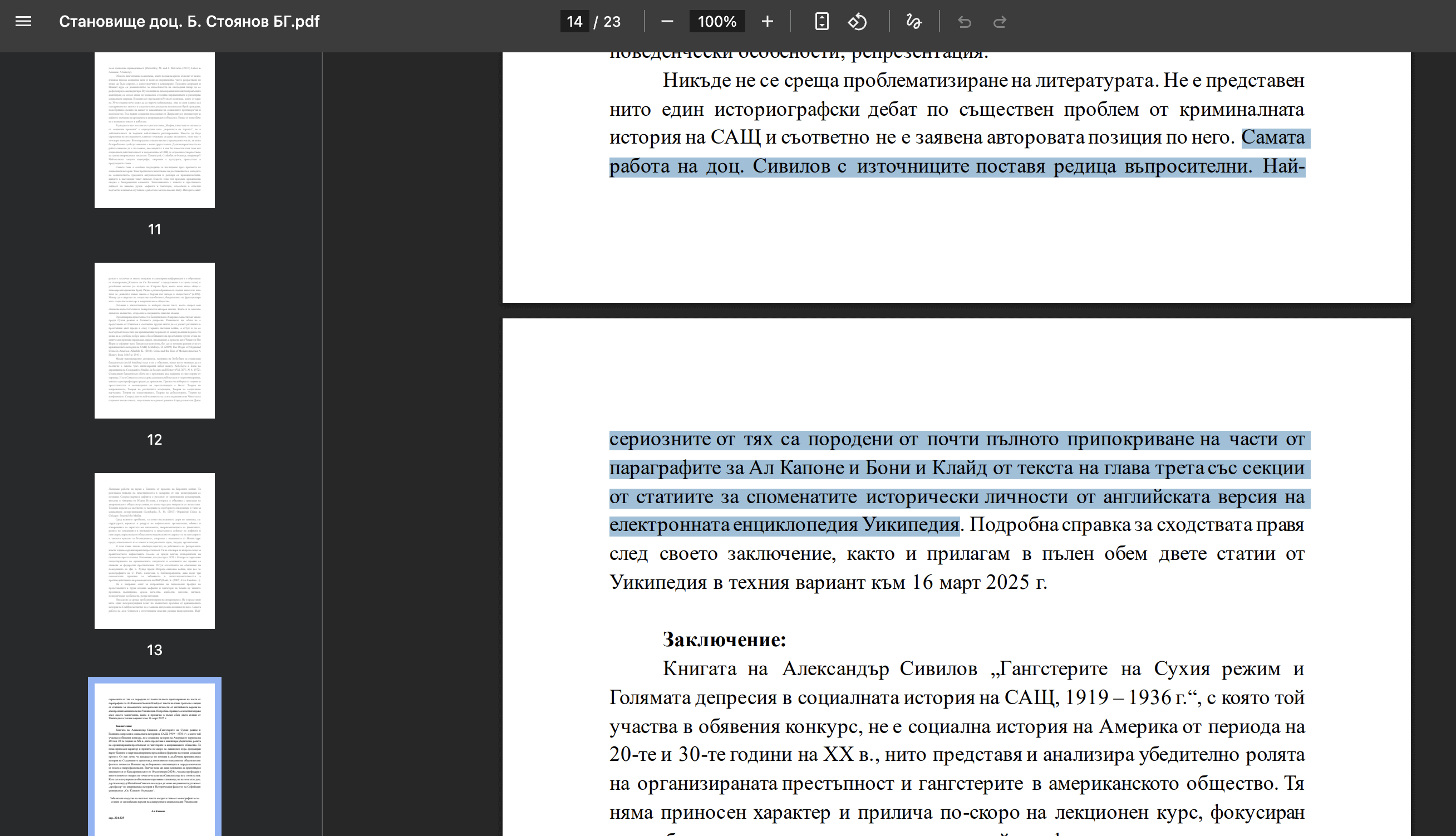 Това не са анонимни твърдения, а заключение на официален рецензент, който случайно се озовава в конкурса и шокиран. В своето становище доц. Борис Стоянов (становището е качено публично в сайта на Софийски Университет - препратка към файла отбелязва „почти пълното припокриване на части от параграфите за Ал Капоне и Бони и Клайд... със секции от статиите за споменатите исторически личности от английската версия на електронната енциклопедия Уикипедия". С други думи, текстът за двамата прочути гангстери в труда на Сивилов се оказва възпроизведен (с минимални разлики) от свободната онлайн енциклопедия Wikipedia. Рецензентът Стоянов е толкова обезпокоен от това и от други "слабости" на работата, че е категоричен в заключението си: „по-уверено и обосновано изразявам становище, че на този етап доц. д-р Александър Сивилов не следва да заеме академичната длъжност 'професор'".